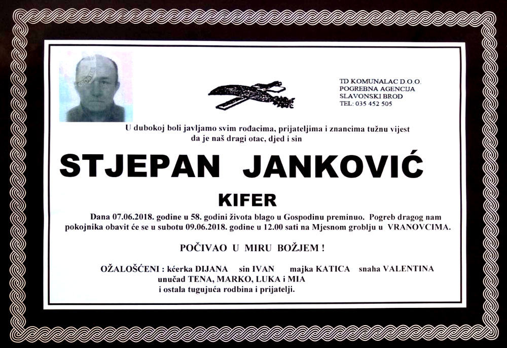 Ovim putem javljamo tužnu vijest da nas je 7. lipnja 2018.g. u 58. godini života napustio još jedan naš hrvatskih vitez i brat po oružju, STJEPAN JANKOVIĆ - KIFER, iz Vranovaca, dragovoljac Domovinskog rata, pripadnik MUP-a RH i 108. brigade ZNG RH Slavonski Brod.