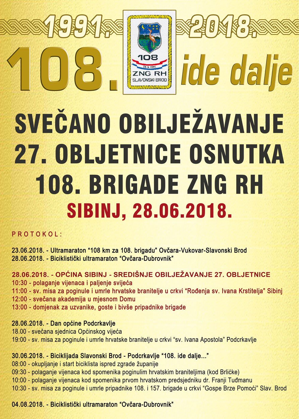 Trkački klub Brace iz Slavonskog Broda, u slavu legendarne 108. brigade Zbora narodne garde RH, u subotu 23. lipnja 2018.g. organizira 12. Ultramaraton u dužini 108 km od Ovčare (Vukovara) do Slavonskog Broda.
