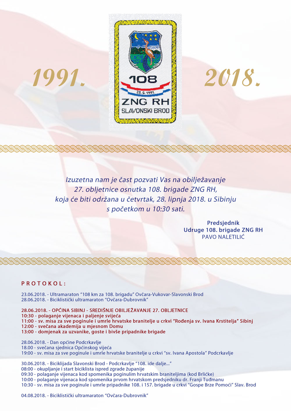 28. lipnja 1991. godine osnovana je 108. brigada Zbora narodne garde u Podcrkavlju nedaleko od Slavonskog Broda. Tim povodom danas je u Sibinju, mjestu gdje je formirana 2. bojna ove brigade, polaganjem vijenaca, a po tom i Svečanom akademijom u mjesnom Društvenom domu, obilježena 27. obljetnica njena osnutka.