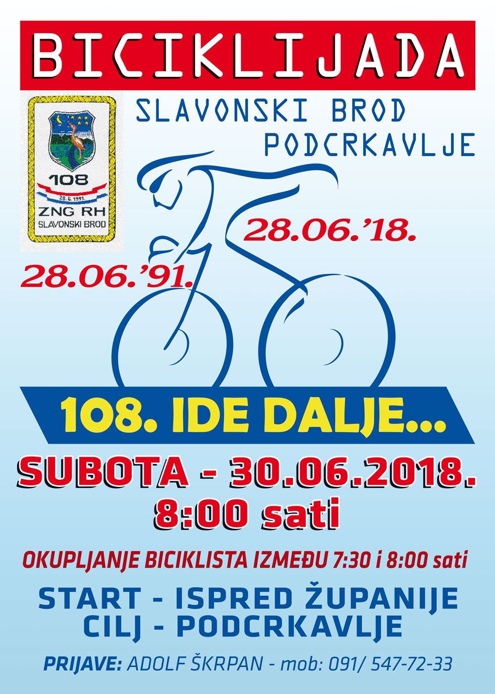 U subotu, 30. lipnja 2018. biti će održana Tradicionalna biciklijada "108. ide dalje....", koja se vozi od Slavonskog Broda do sela Podcrkavlje, mjesta gde je 28. lipnja 1991. formirana dragovoljačka legendarna 108. brigada ZNG RH Slavonski Brod.